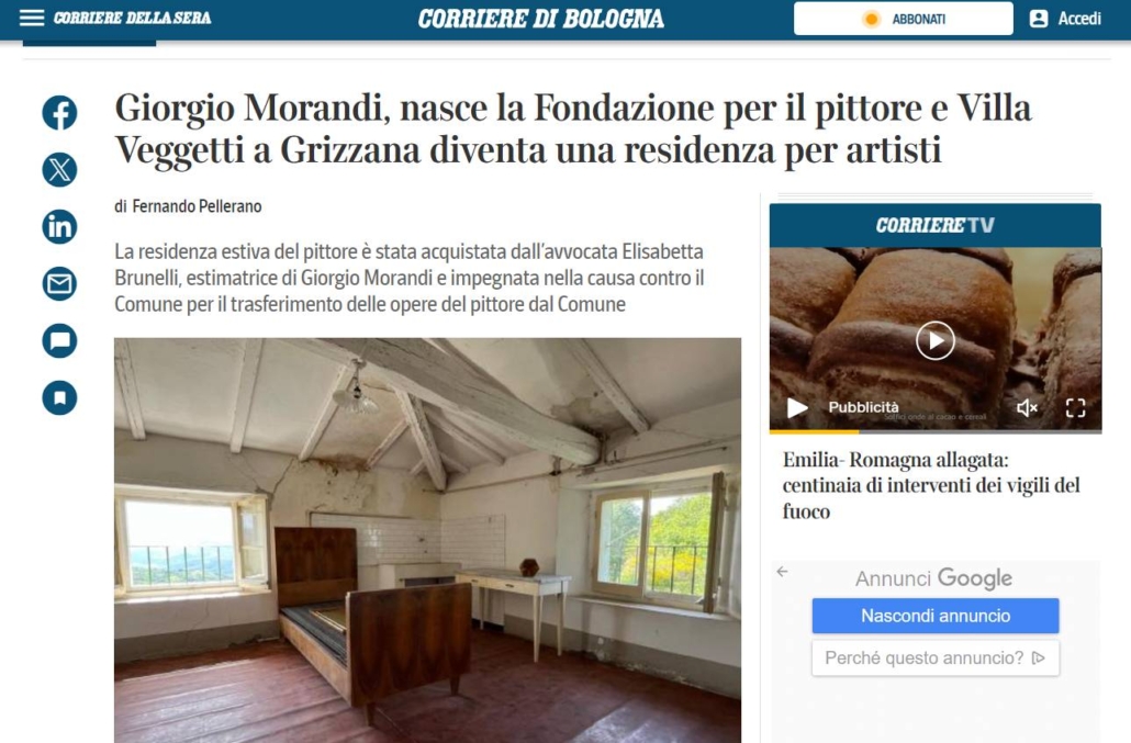 La Fondazione è stata presentata a Grizzana Morandi nel 60esimo anniversario della scomparsa del pittore, a Villa Veggetti, dove il maestro passava le estati con le sorelle e dove ancora si può vedere il suo monacale atelier, le camere da letto e naturalmente tutte le finestre «ispiratrici». La villa è stata acquistata dall’avvocato Brunelli e conferita alla Fondazione che ha come vicepresidente Maria Teresa Cremonini, mentre i componenti del consiglio direttivo e del comitato scientifico verranno ufficializzati a settembre dopo le adesioni che sono in corso.